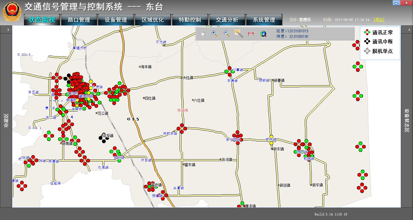 基于GIS地圖形式的信號(hào)控制系統(tǒng)中心綜合信息(路網(wǎng)交通流、設(shè)備運(yùn)行狀態(tài)及基礎(chǔ)狀態(tài))顯示:
